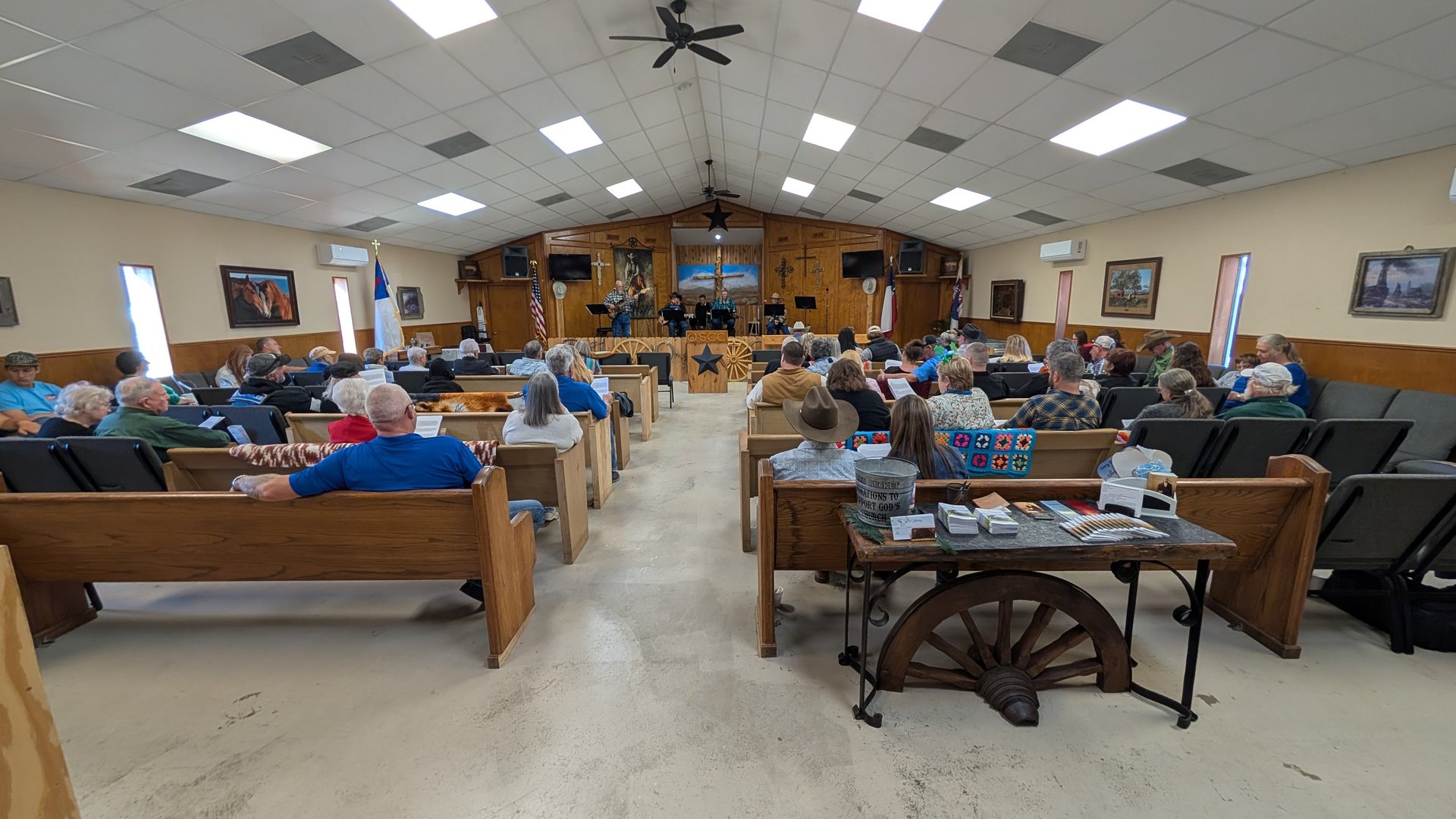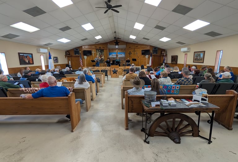 Sunday Gatherin' is our worship service, with a “come-as-you-are” rule, and consists of announcements, prayer and praise requests, music and a message/sermon. There is no alter call nor is a collection plate passed. There is a bucket (called the feed bucket) as you enter the sanctuary where tithes and offerings are collected. Country, western, bluegrass, hymns or gospel music and singing is provided by our band. People wear hats during the service, and men remove them during prayers.